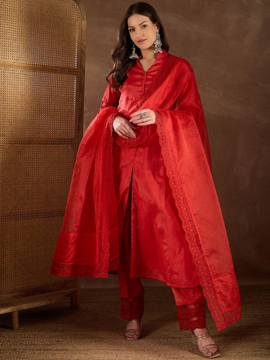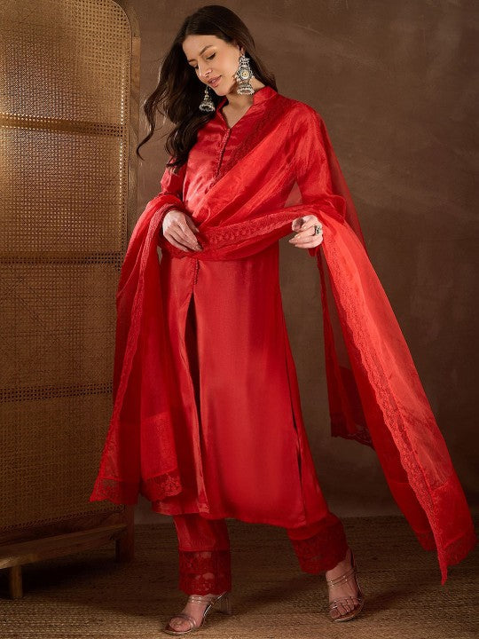 Inddus Women Floral Embroidered High Slit Thread Work Kurta