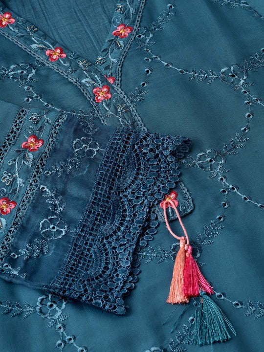 Ishin Floral Embroidered Regular Thread Work Pure Cotton Kurta with Trousers & Dupatta
