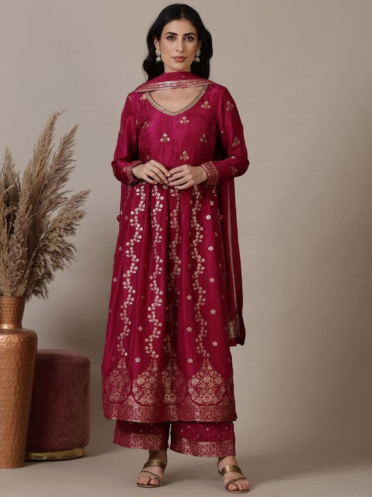 AURELIA Floral Self Design Beads and Stones A-Line Kurta with Palazzo & Dupatta