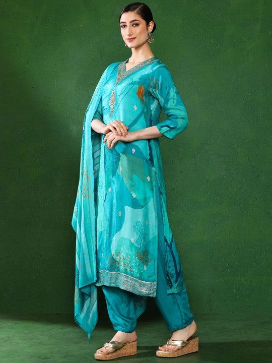 Jaipur Kurti Women Floral Embroidered Cotton Kurta with Trousers & Dupatta