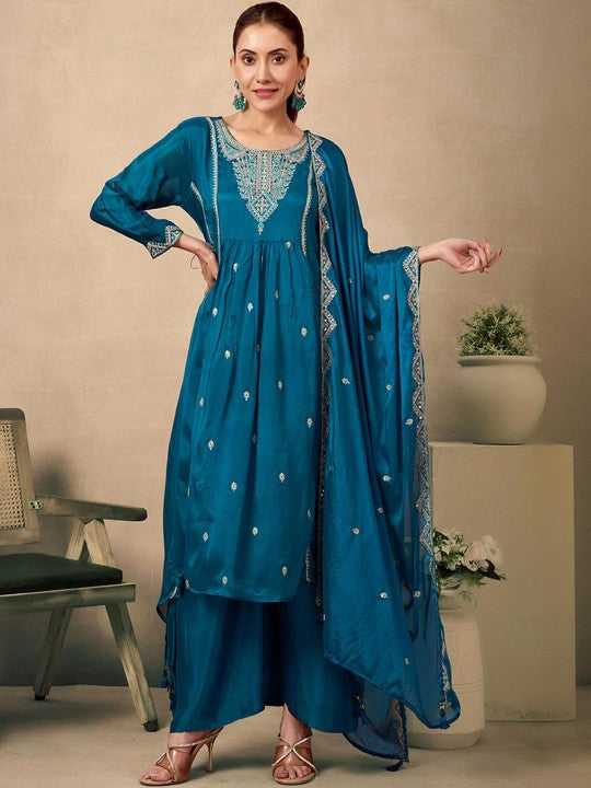 Teal Thread Embroidered Viscose Chinon A-Line Salwar Suit