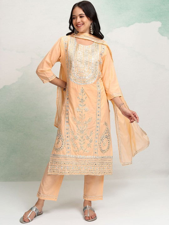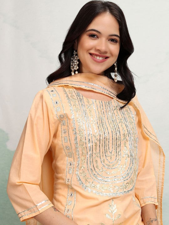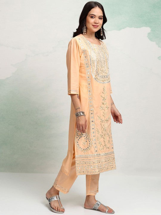 Vishudh Peach Coloured Embroidered Pure Cotton Straight Kurta with Trousers & With Dupatta