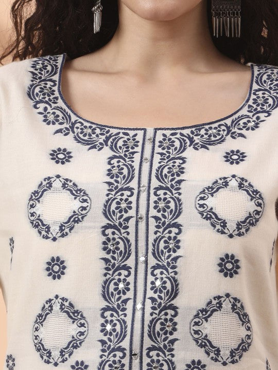 Yufta Floral Embroidered Pure Cotton Round Neck Straight Kurta With Trousers And Dupatta