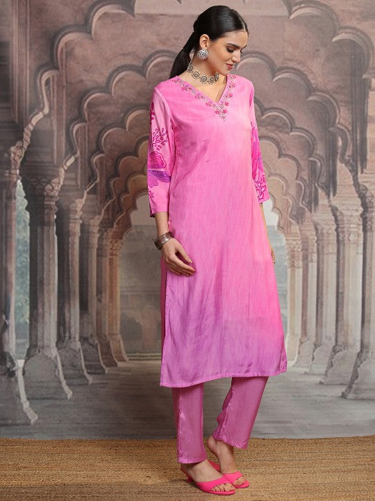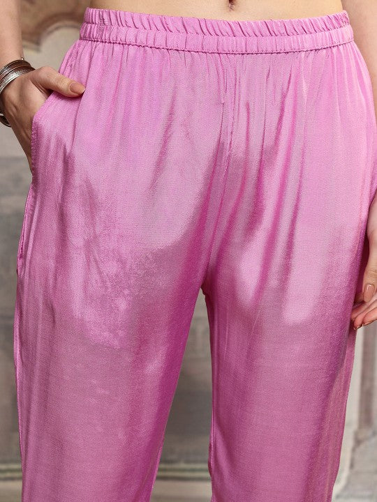 Vishudh Pink Floral Yoke Design Thread Work Straight Kurta With Trousers & Dupatta