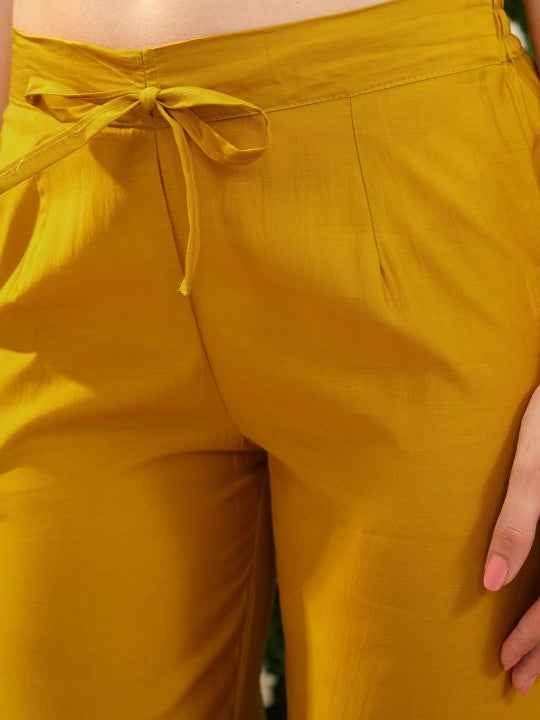 Vishudh Mustard Yellow Floral Yoke Design Thread Work Kurta With Trousers & Dupatta