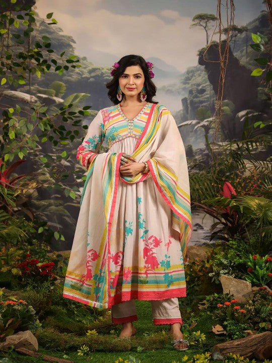 AARAAS Floral Printed Thread Work Anarkali Pure Cotton Kurta With Trousers And Dupatta
