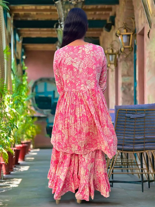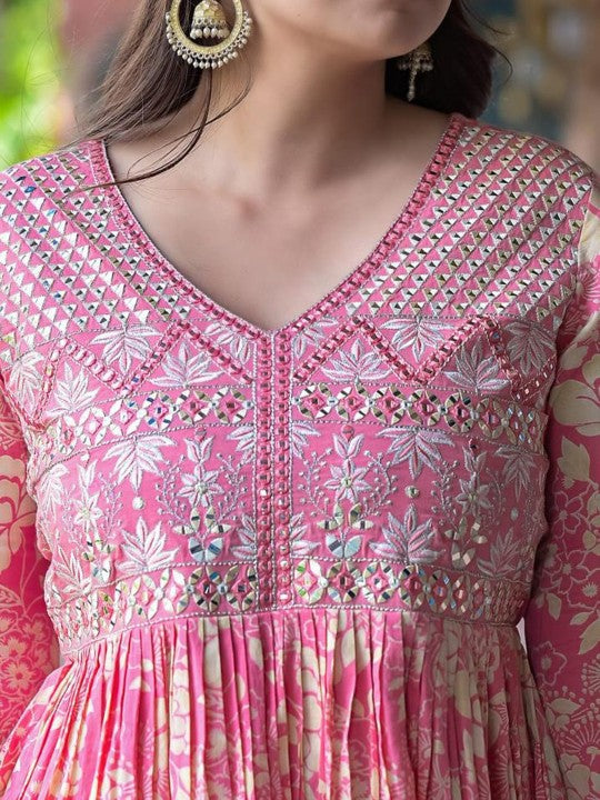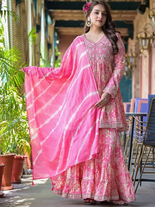 Varanga Floral Printed Mirror Work Anarkali Kurta With Sharara & Dupatta