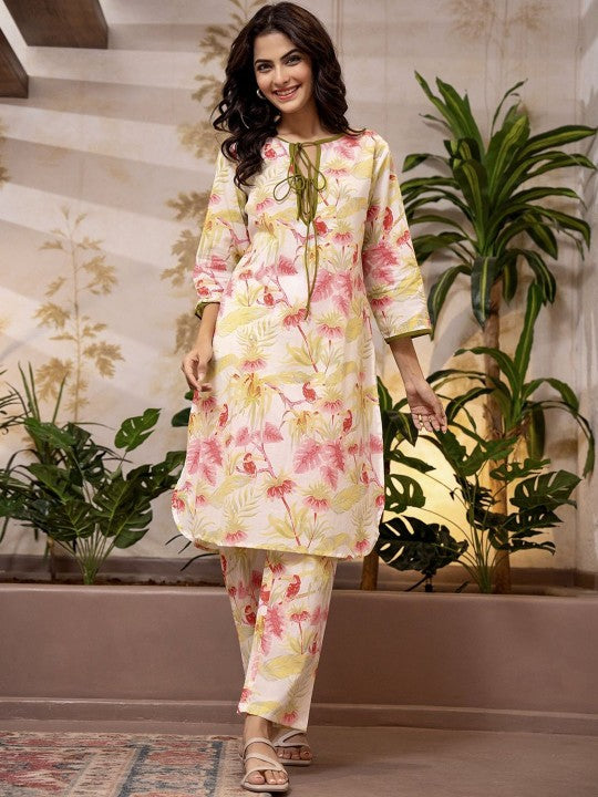 FEATHERS CLOSET Floral Printed Tie Up Neck Pure Cotton Tunic With Trousers