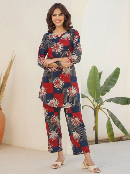 Women Navy Blue Pure Cotton Geometric Printed Straight Co-ord Set