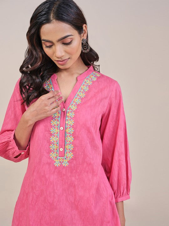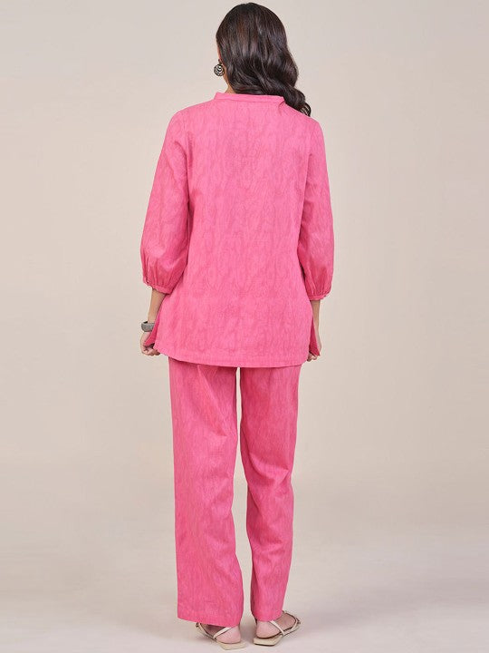 Global Desi Abstract Printed Thread Work Mandarin Collar Pure Cotton Top With Trouser