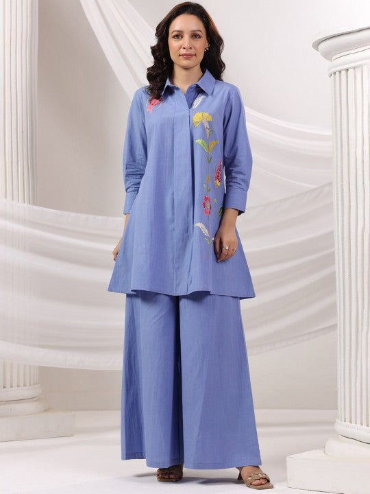 AUTUMN LANE Embroidered Pure Cotton Shirt Collar Top With Trousers Co-Ords Set