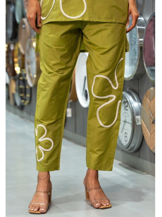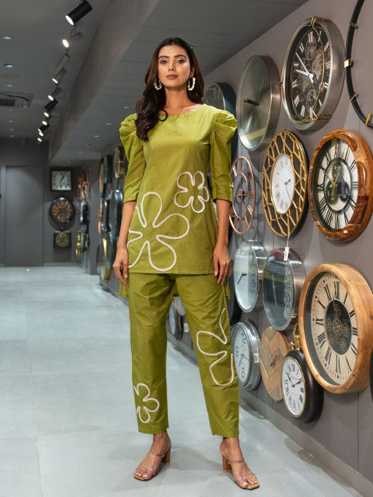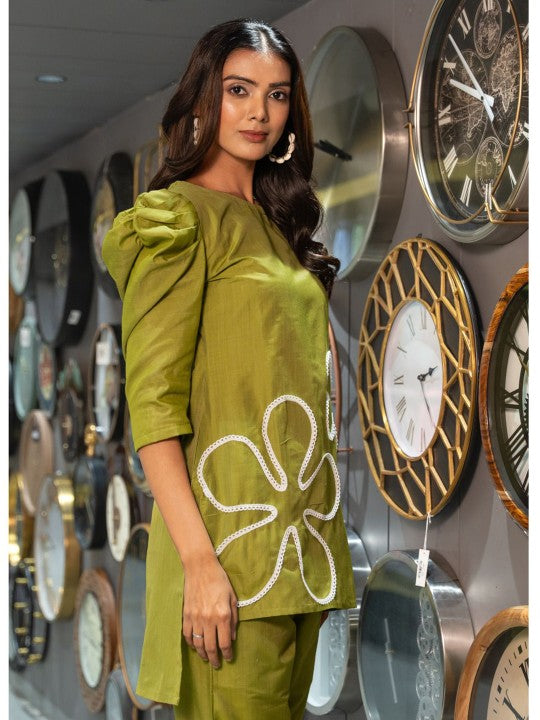 WEAVLLITE Floral Embroidered Lace Boat Neck Puffed Sleeves Top With Trousers