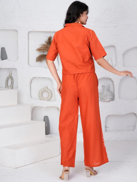 JALTHER Embroidered Pure Cotton Shirt Collar Neck Top & Palazzo Co-Ords