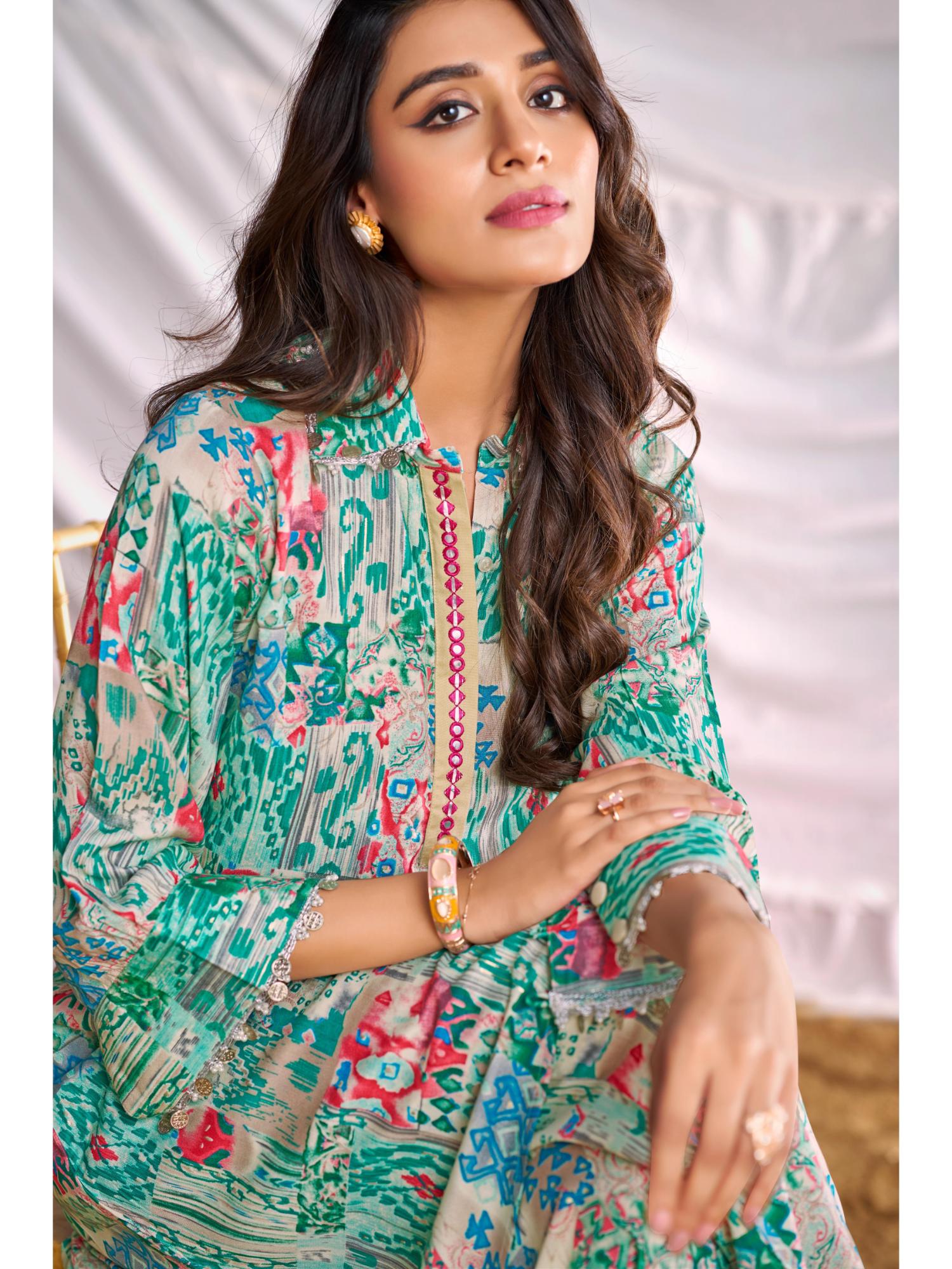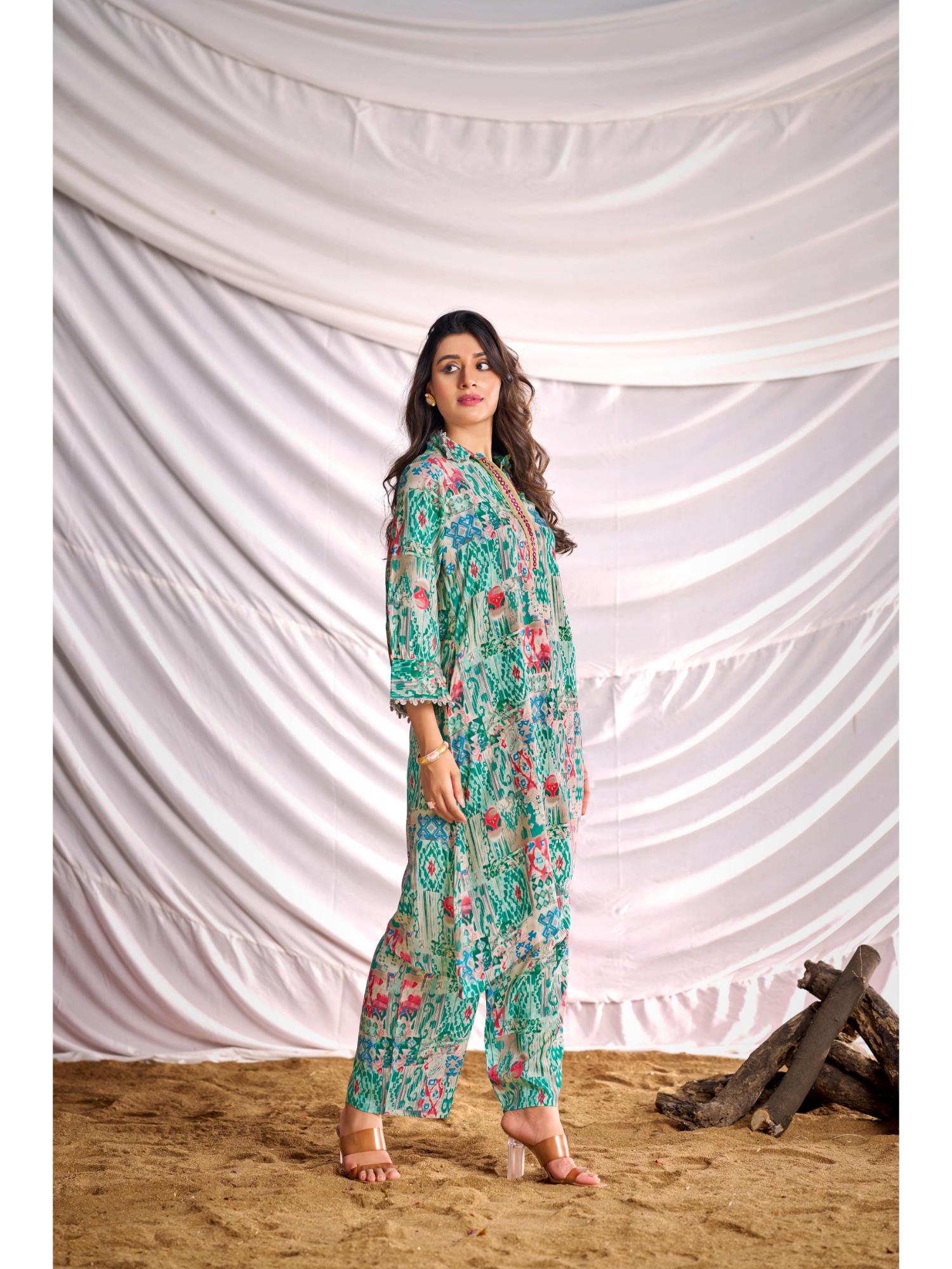 Women Green Printed Mirror Work Co-Ord (Set of 2)