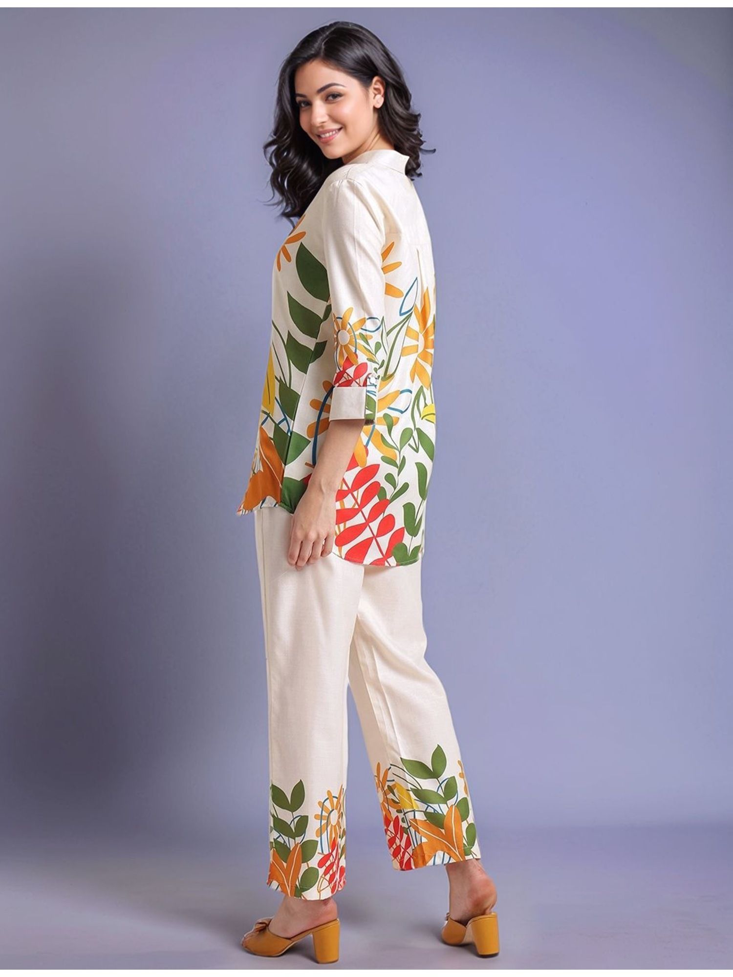 Cream Women's Floral Printed Cotton Blend Shirt with Trousers (Set of 2)