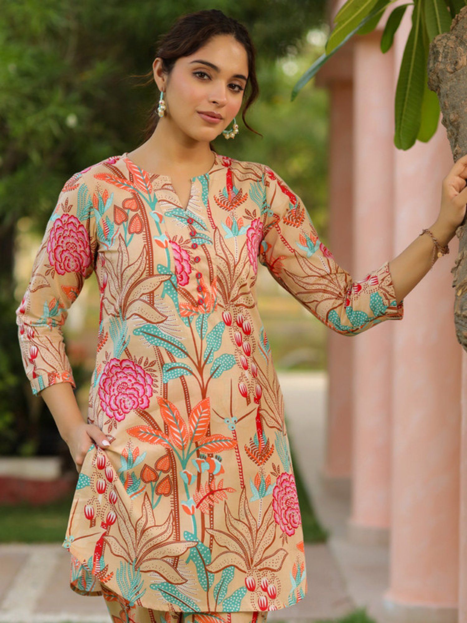 Beige Floral Printed Pure Cotton Co-Ord Set