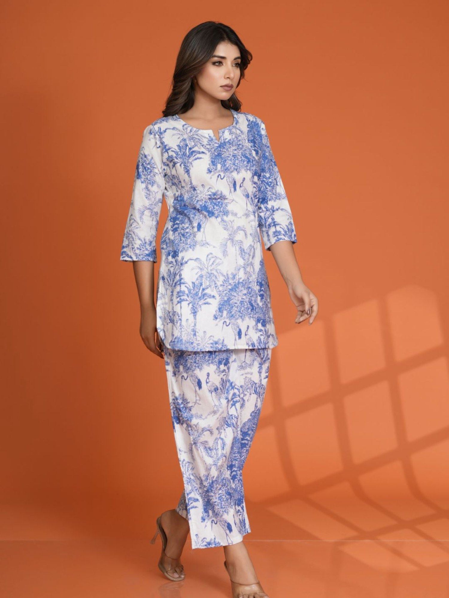 Blue Tree and Bird Motif Printed Cotton Cambric Co-Ord (Set of 2)
