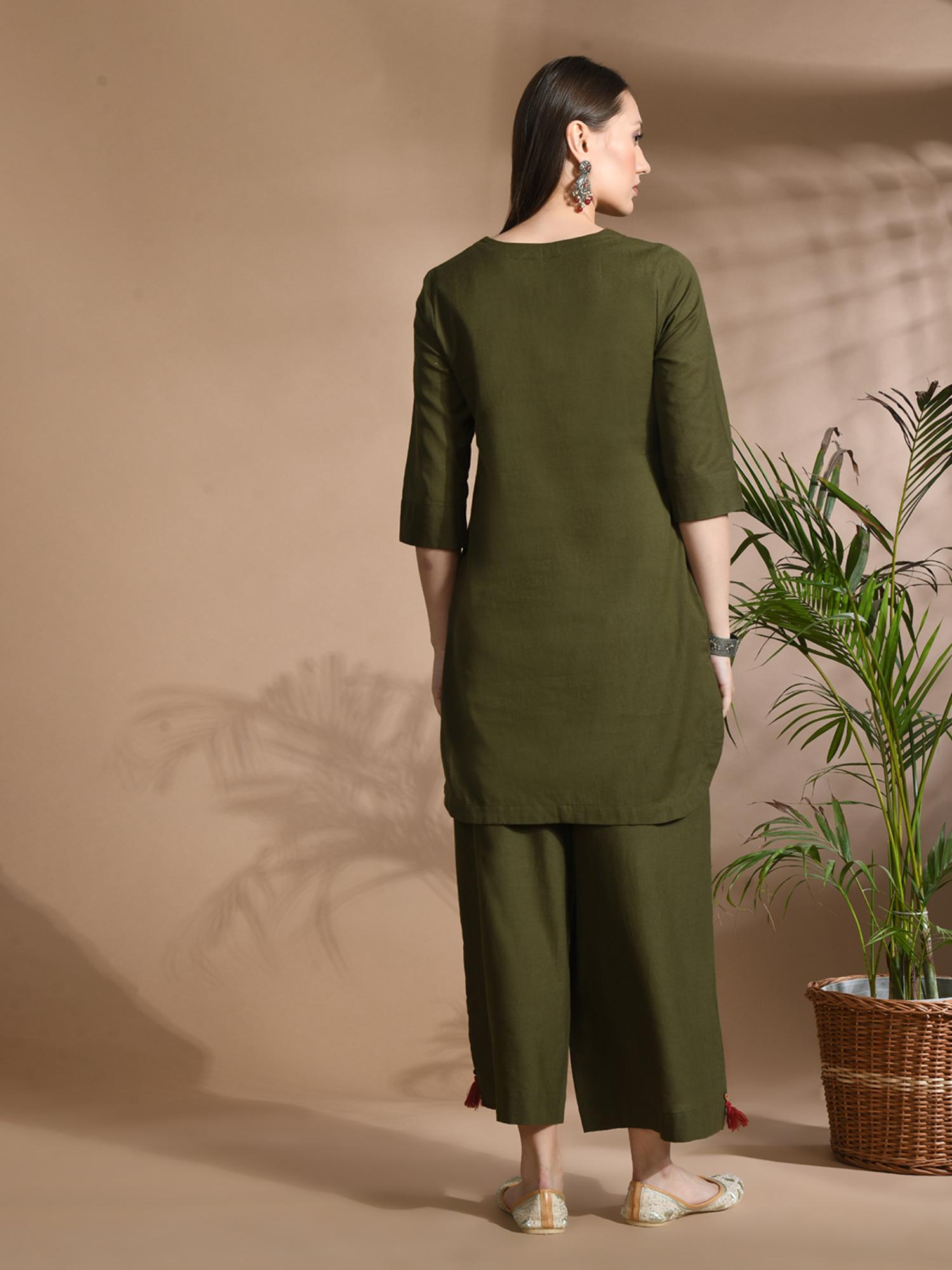Cotton Solid/ Plain with Neckline Embroidered & Beaded Green Co-Ord (Set of 2)