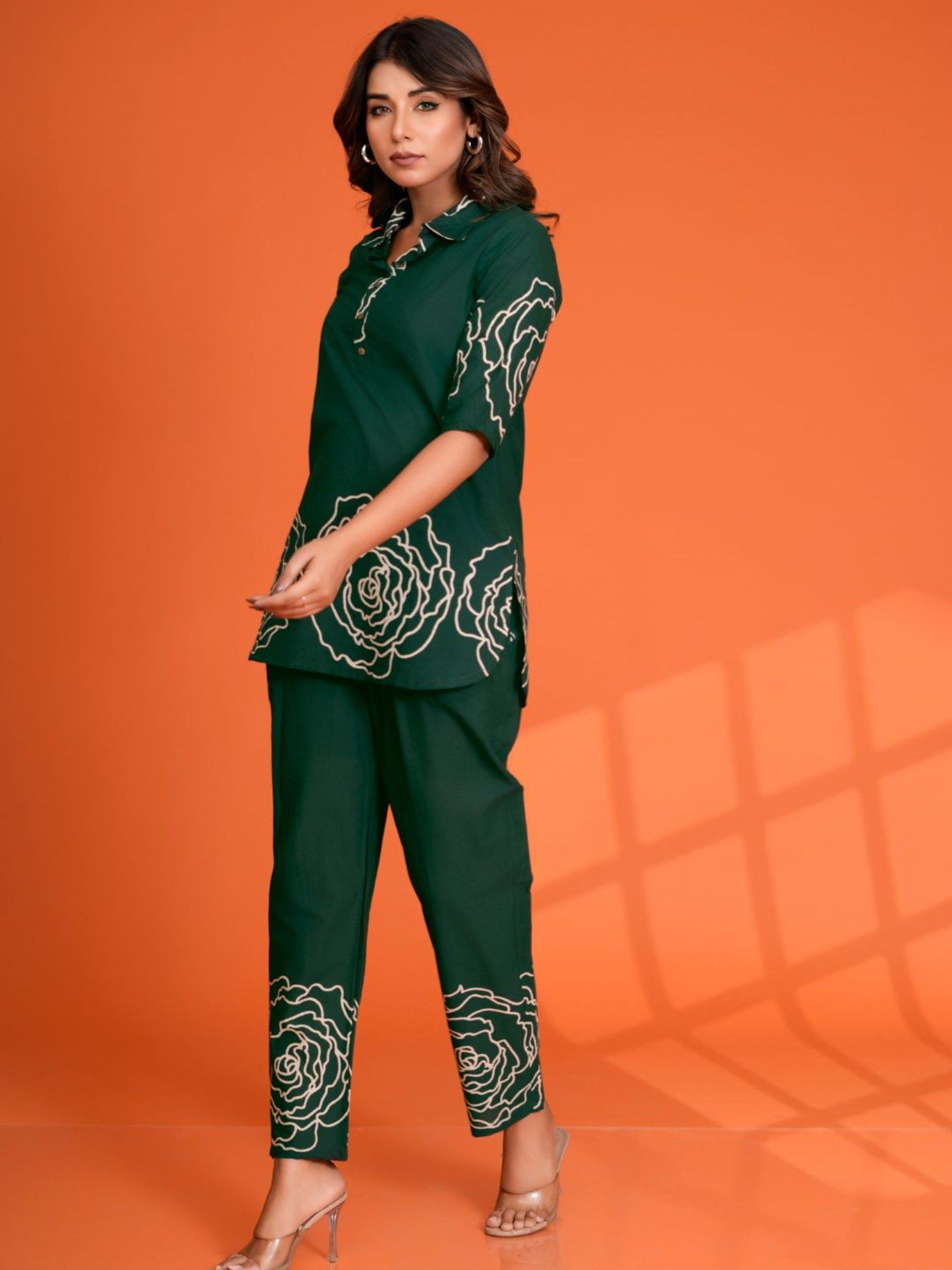 Bottle Green Floral Printed Cotton Co-Ord (Set of 2)