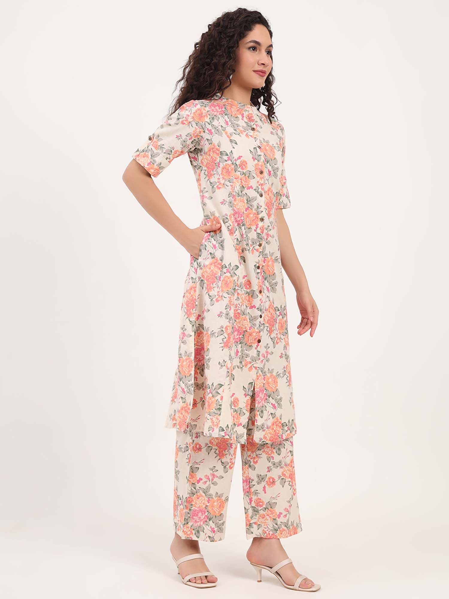 Cream Floral Printed Cotton Co-Ord (Set of 2)