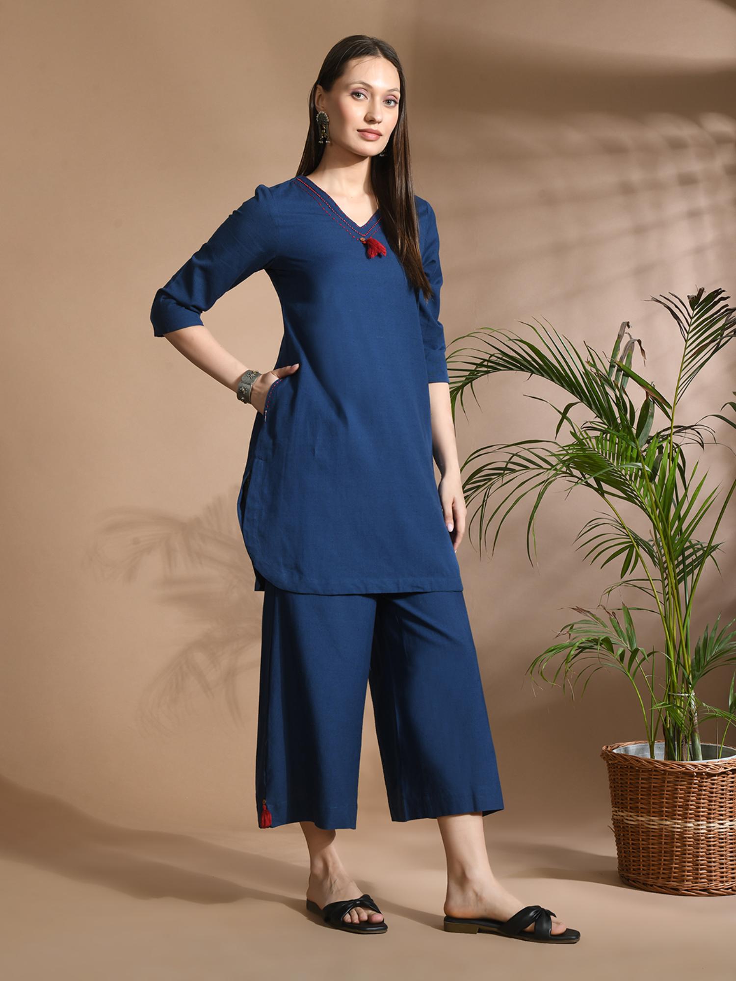 Cotton Solid/ Plain with Neckline Embroidered & Beaded Blue Co-Ord (Set of 2)