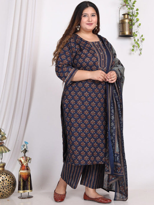 Swasti Plus Size Ethnic Motif Printed Gotta Patti Cotton Kurta With Trousers & Dupatta