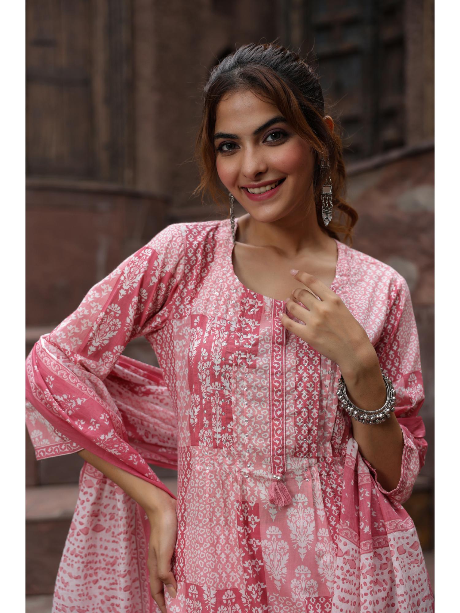 Women Peach Printed Sequinned A-line Kurta with Trouser and Dupatta (Set of 3)