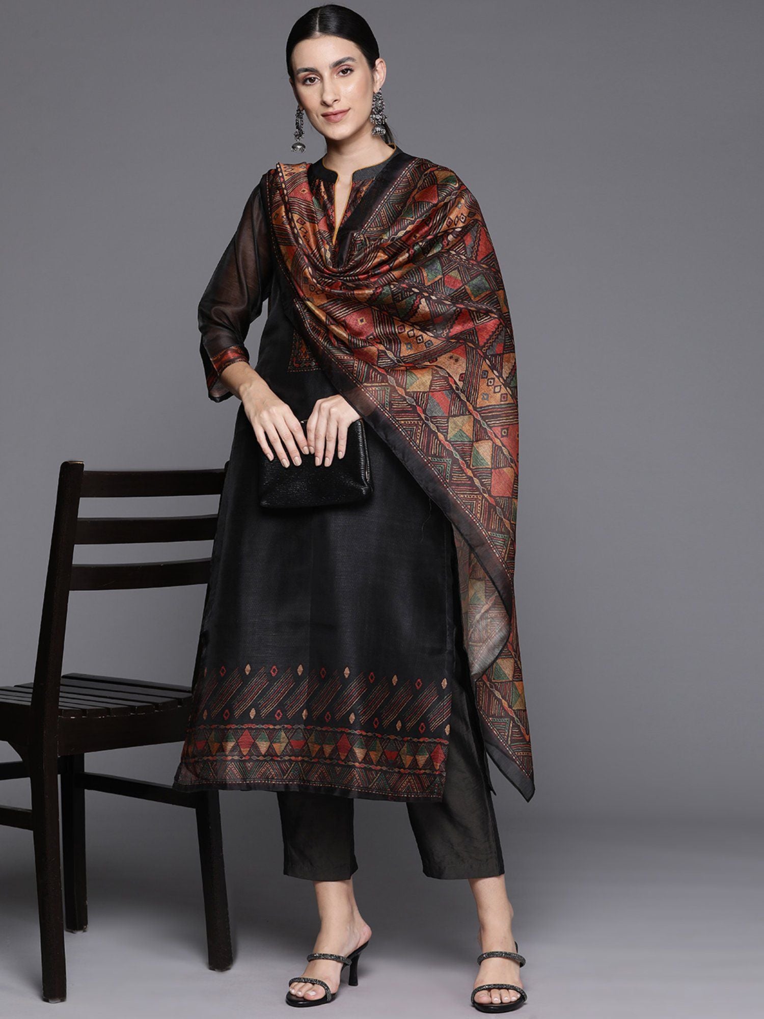 Black Printed Straight Kurta Paired With Solid Pant And Printed Dupatta (Set of 3)