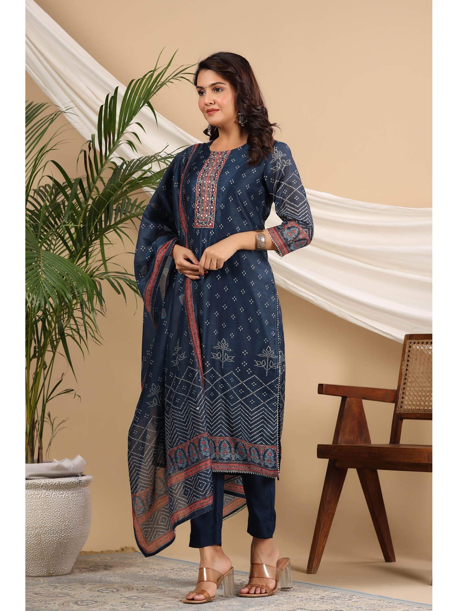 Women Blue Bandhani Sequinned Straight Kurta With Pant And Dupatta (Set of 3)