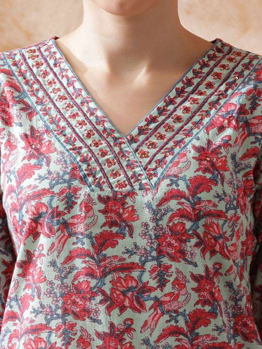 STYLEBAAZI Embroidered V-Neck Sequinned Pure Cotton Straight Kurta With Trouser & Dupatta