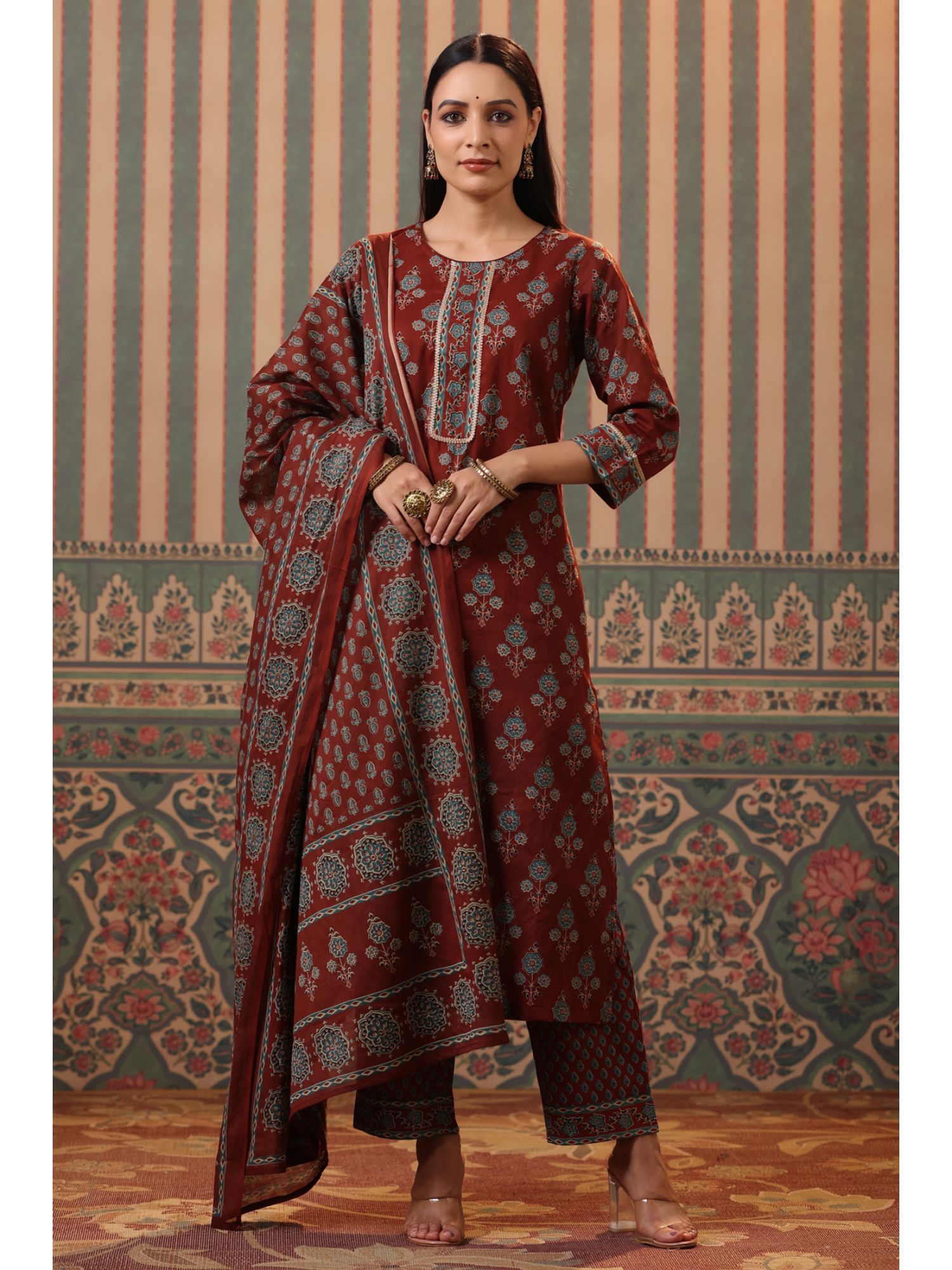Women Rust Ethnic Printed Straight Kurta with Palazzo and Dupatta (Set of 3)