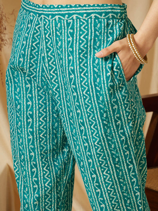Ginni Arora Label V Neck Floral Printed Cotton Straight Kurta with Palazzo & Dupatta