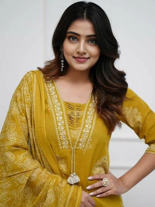 Floral Printed Square Neck Sequinned Pure Cotton Kurta With Trousers & Dupatta