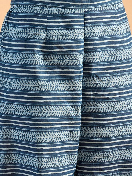 Indo Era Blue Floral Printed V-Neck Pure Cotton Straight Kurta with Palazzo & Dupatta