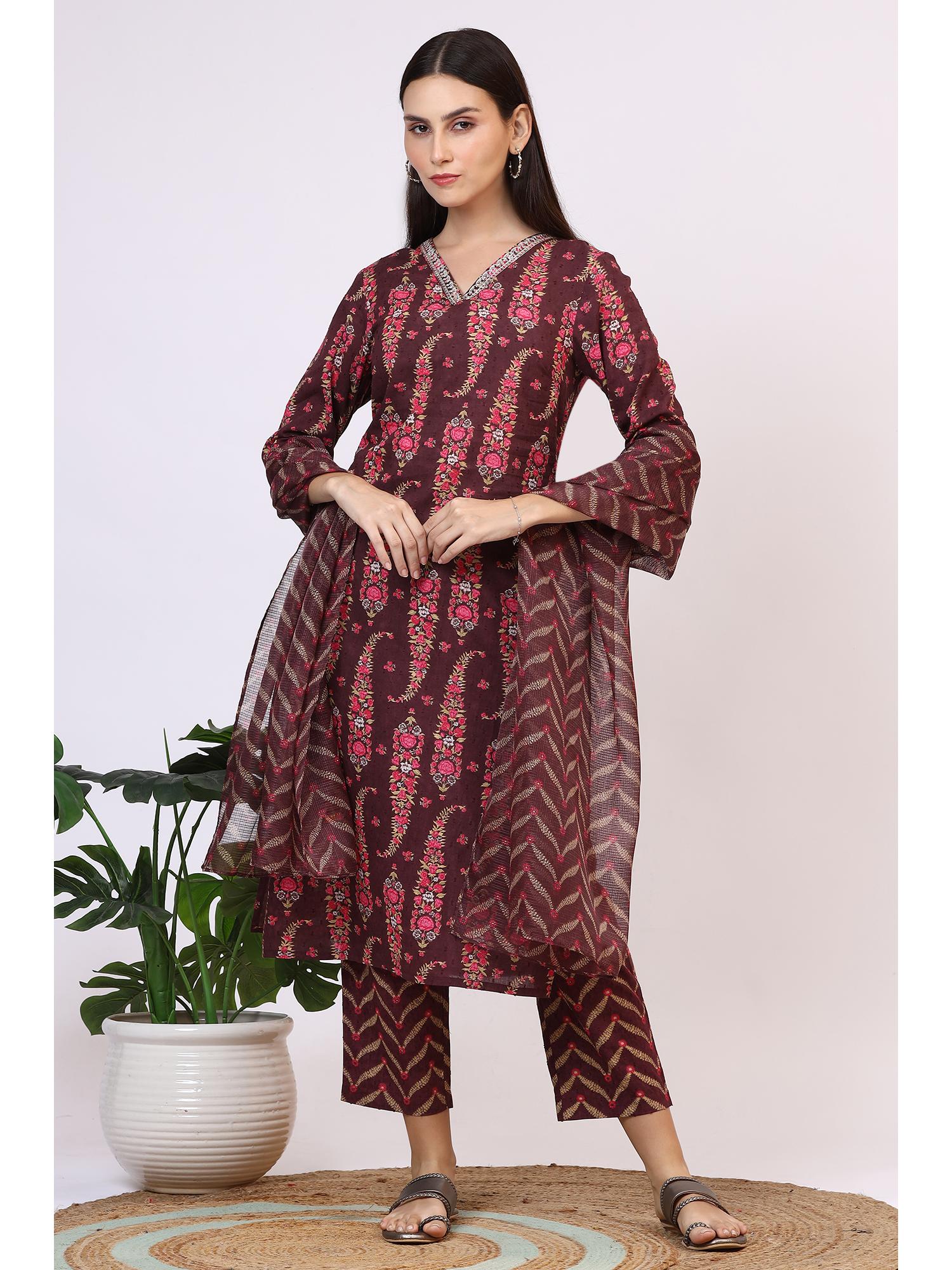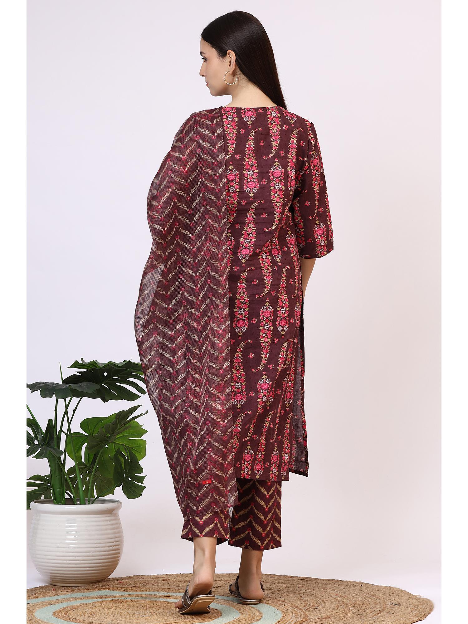 Womens Wine Floral Printed Pure Cotton Straight Kurta with Pant & Dupatta
