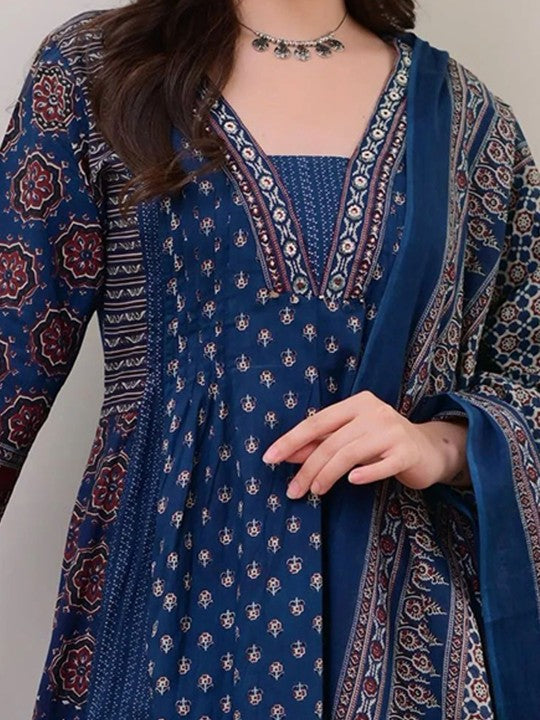 Floral Printed V Neck Anarkali Kurta With Trousers & Dupatta