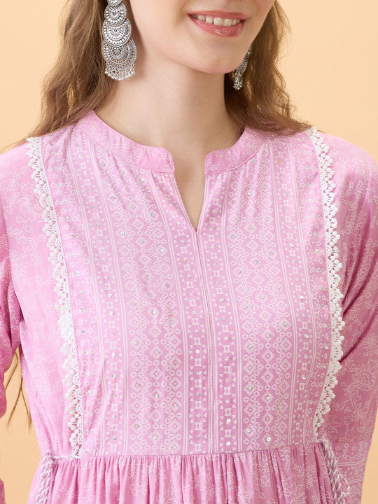 Globus Floral Printed Mandarin Collar Fit & Flare Lace Detail Tiered Cotton Maxi Dress