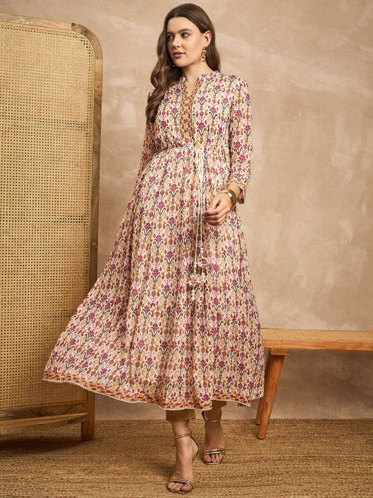 all about you Floral Printed Ethnic Motifs Mandarin Collar Midi Ethnic Dress