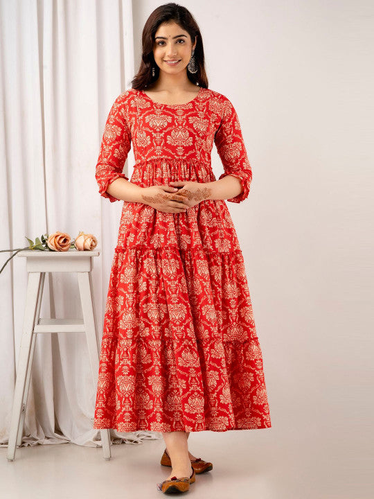 VARICOS Ethnic Motifs Printed Tiered Maternity Fit and Flare Midi Ethnic Dress