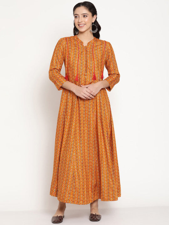 Be Indi Rayon Embroidered and Ethnic Motifs Printed Mandarin Collar Maxi Dress