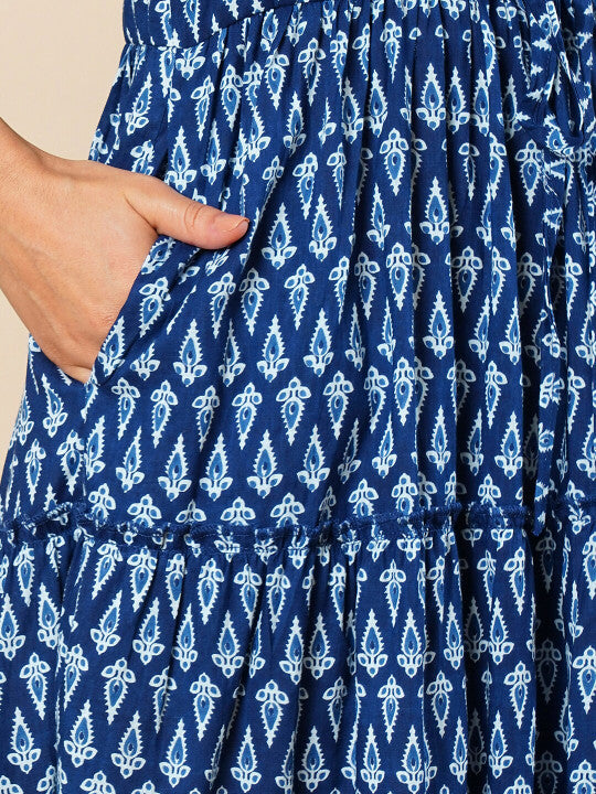 Globus Mandarin Collar Puff Sleeves Ethnic Motifs Tiered Fit & Flare Fusion Maxi Dress