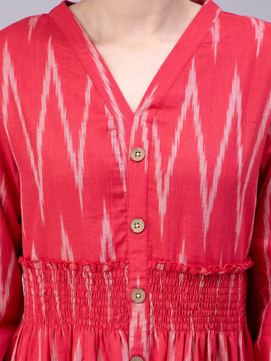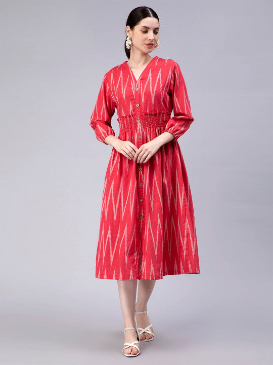 ENTELLUS Geometric Printed V-Neck Smocked Cotton A-Line Midi Dress