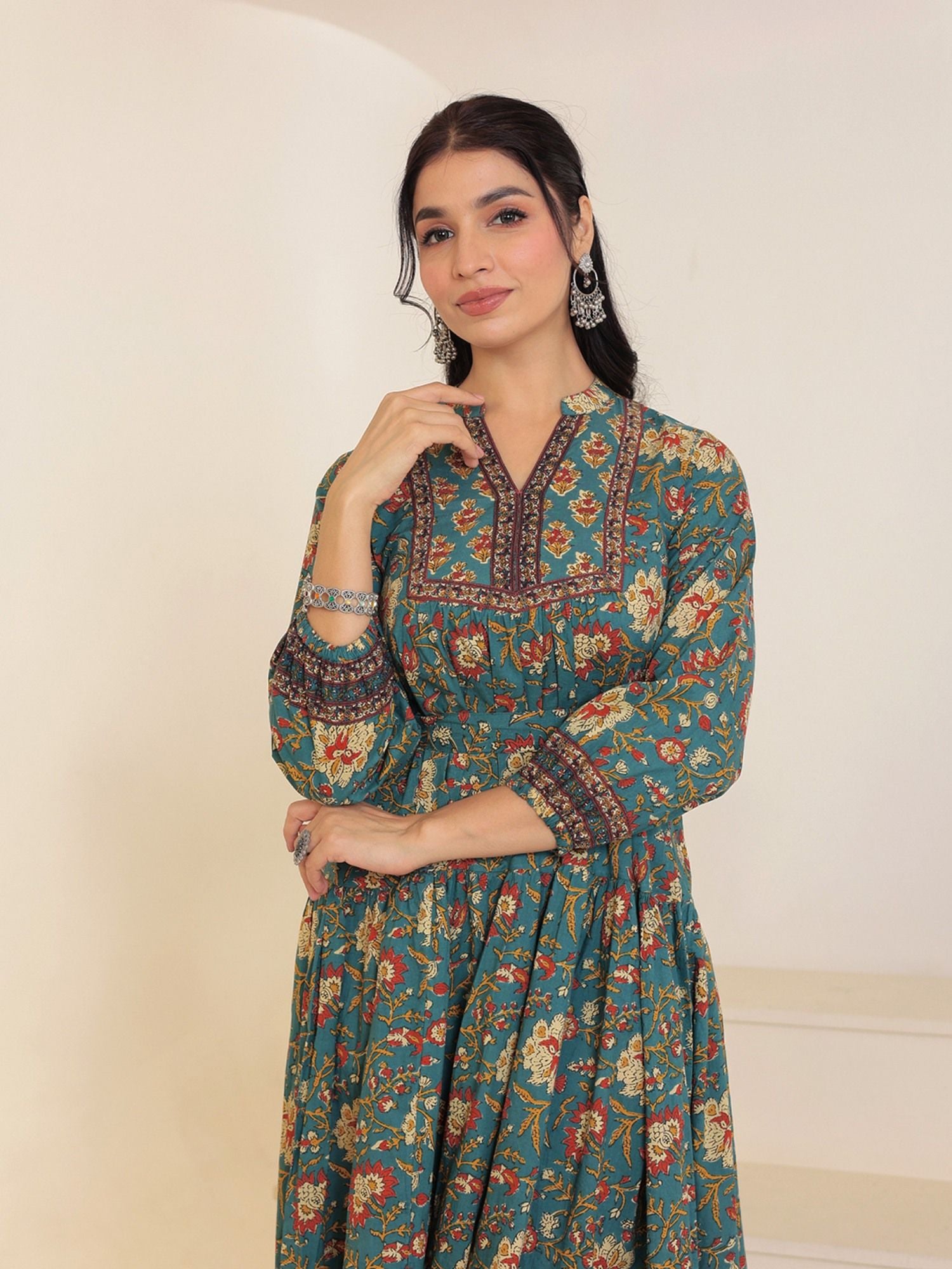 Floral Printed Bishop Sleeves Ethnic A-Line Midi Dress Green