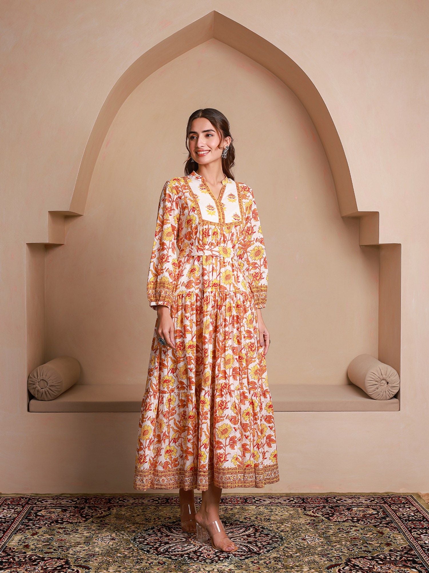 Yellow Floral Printed Bishop Sleeves Ethnic A-Line Dress (Set of 2)