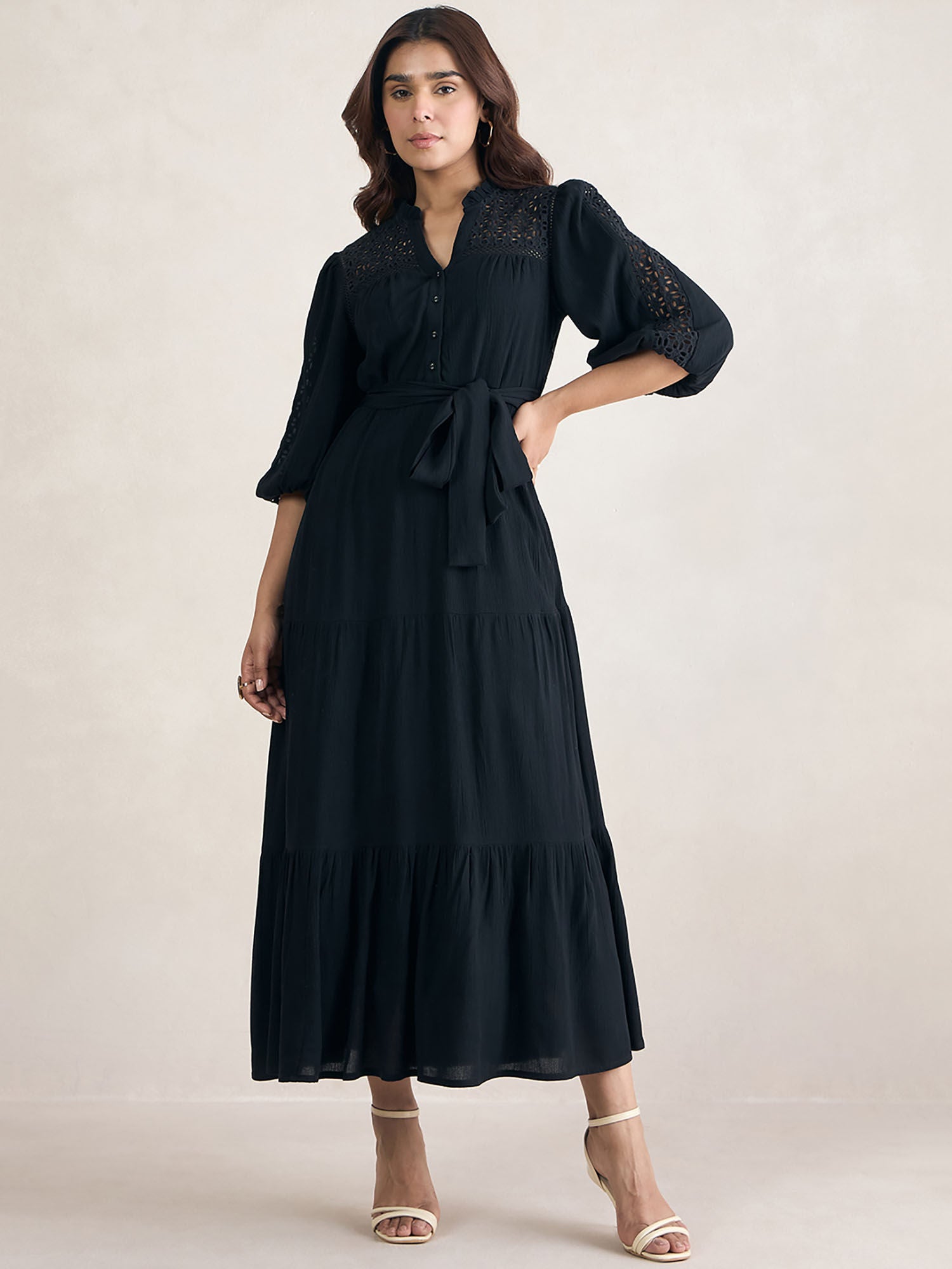 Black Schiffli Tiered Maxi Dress with Belt (Set of 2)