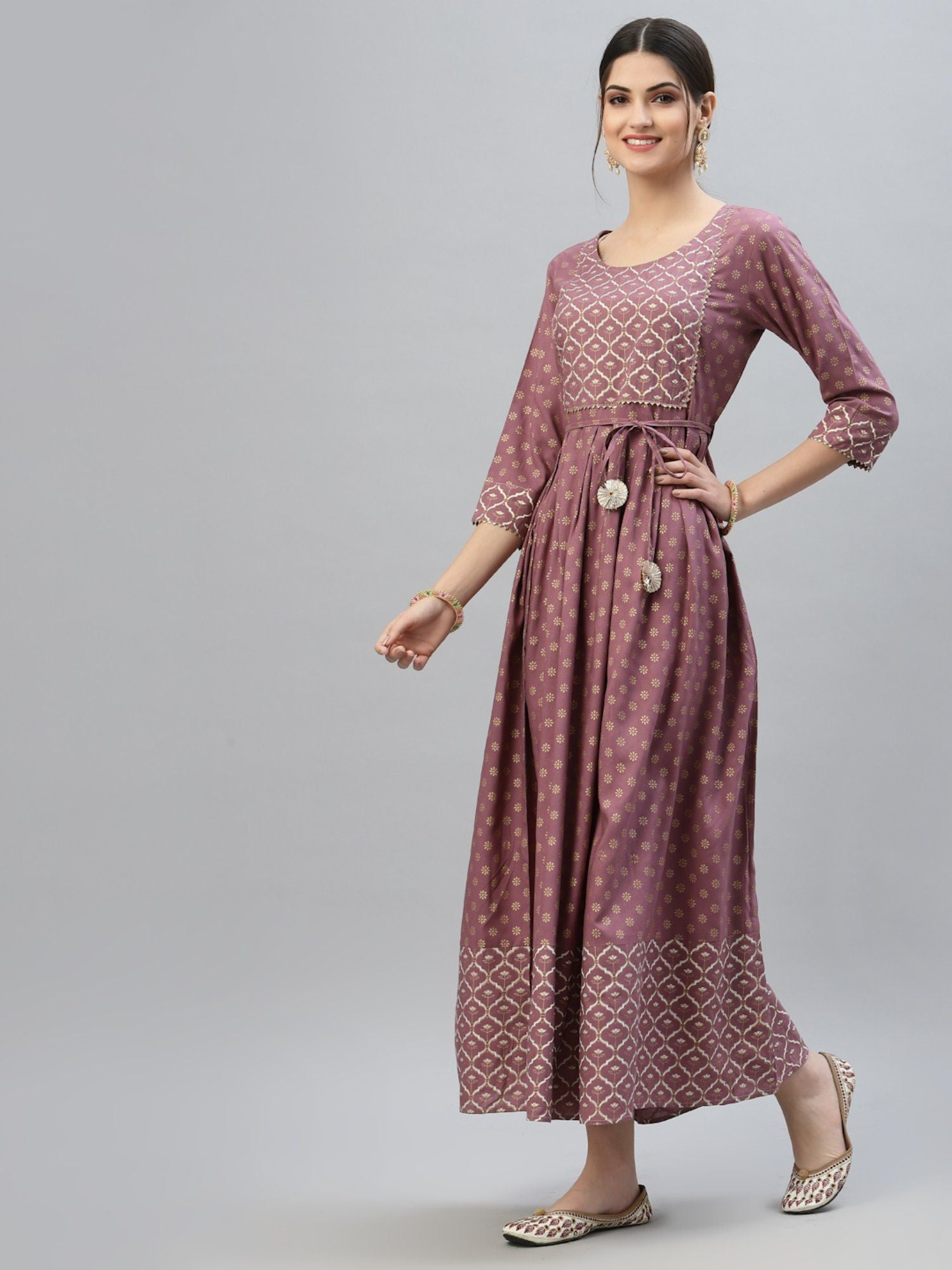 Womens Gold and Khari Printed Rayon Flared Long Ethnic Dress