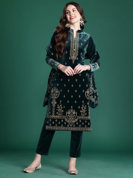 Cayman Woven Design Velvet Finish Pure Wool Kurta with Trousers & Dupatta