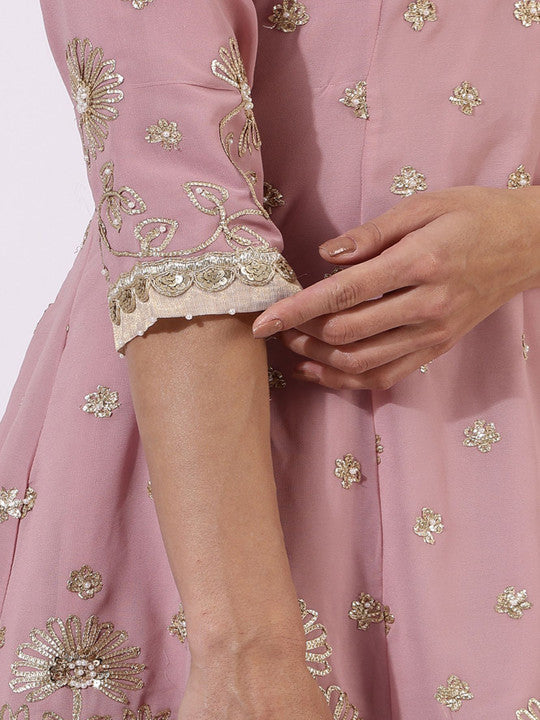 WISHFUL Floral Embroidered Sequinned V-Neck Panelled A-Line Kurti With Sharara & Dupatta