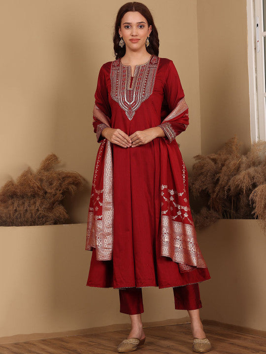 W Red Round Neck Three-Quarter Sleeves Regular Sequinned Kurta With Trouser With Dupatta