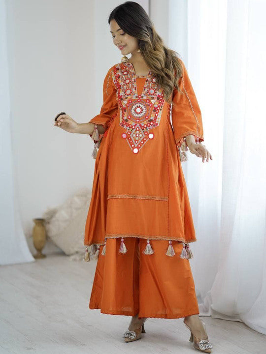 SWEETPEL Women Ethnic Motifs Embroidered Mirror Work Raw Silk Kurta with Palazzos